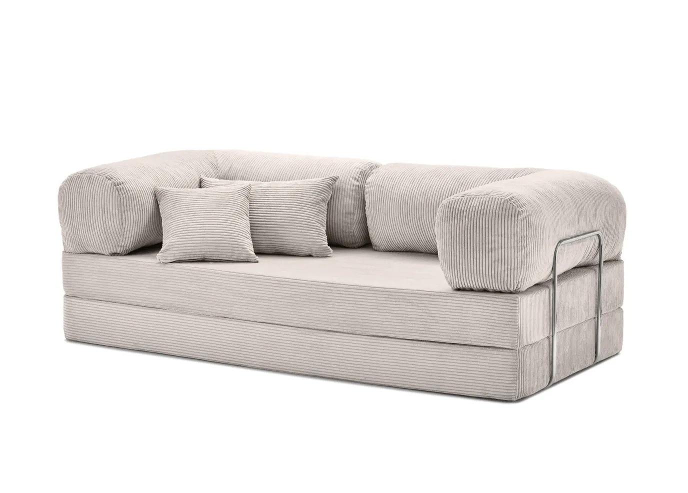 Comprising two quality mattresses and two angled cushions, TEDDY is designed for easy rearrangement. Secured by three chrome-plated metal bars, TEDDY maintains its flexibility. The mattresses, crafted from high-grade cold foam, strike a balance between firm support and comfort for both sitting and sleeping. The angled cushions are filled with silicon ball fiber encased in an inner fabric sleeve, allowing for easy removal of the outer fabric without disturbing the foam. TEDDY is swathed in plush corduroy fabric known for its exceptional quality and durability.